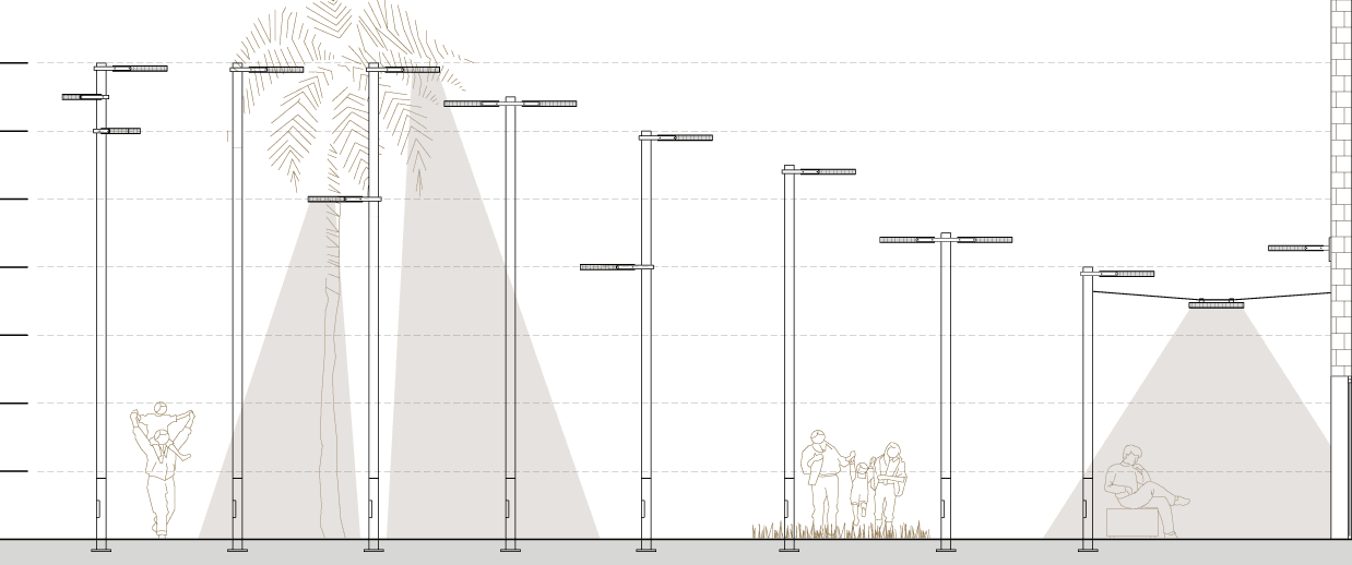 Sin pretenciones y con la máxima presencia, la luminaria TETRIS y la columna EDGE se anexan, y mediante la nueva brida Lace, conforman una familia de puntos de luz en que los componentes se unen, pero no se tocan, aportanto ingravidez y ligereza al conjunto.